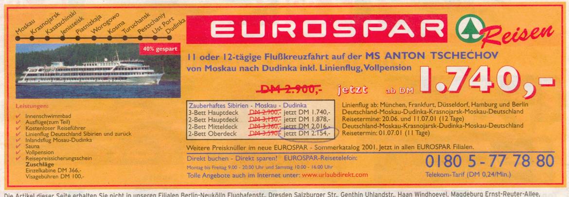 Kurz darauf erfolgte allerdings die Ernüchterung, als uns das Reisebüro mitteilte, daß die Reise zwar verfügbar war, aber das es leider keine Flüge mehr gab, und das sie deshalb unsere Buchung nicht bestätigen konnten. Schade, dachten wir uns, wenn uns die Kommunisten nicht haben wollen, dann gehen wir eben in die USA, das geht immer. Kurz nachdem ich mir dann einen USA Reiseführer gekauft habe, kam ein FAX vom Reisebüro. Darin wurden uns einige Alternativtermine angeboten. Also USA Reiseführer wieder ins Regal gestellt, und vom 1.August 2001 bis zum 12.August 2001 eine Flußkreuzfahrt auf dem Jenissei vom Dudinka nach Krasnojarsk gebucht, mit einem Ausflug zum Baikal See.